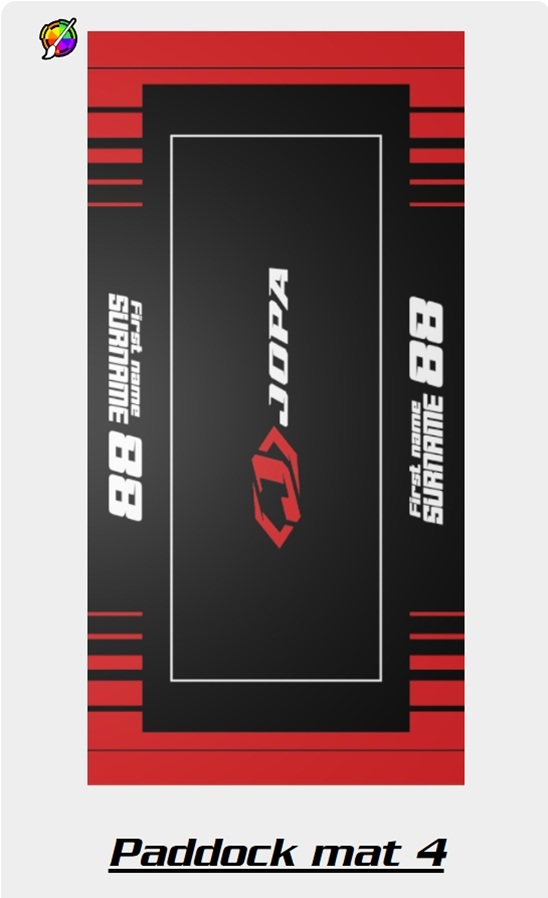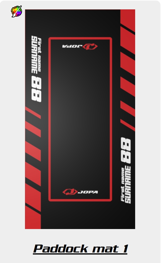 Ge din motorcykelplats ett professionellt och personligt utseende med den specialdesignade depåmattan från JopaMX. Med vår användarvänliga konfigurator kan du designa en unik matta som perfekt matchar din stil i bara några få steg. Lägg till ditt eget namn, nummer och logotyper och välj bland en mängd olika färger för att skapa din ideala design. Mattan är inte bara snygg utan också funktionell. Dess robusta gummibaksida skyddar ytan från olja och smuts. Perfekt för användning under tävlingar, träningspass eller i verkstaden. Gör din motorcykelparkeringsplats till ett riktigt blickfång – börja designa idag!