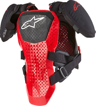 - Bröst- och ryggskydden sitter säkert på plats med justerbara axelremmar – den nedre delen fästs med lättanslutna spännen och V-remmar som också håller revbensskydden på plats.