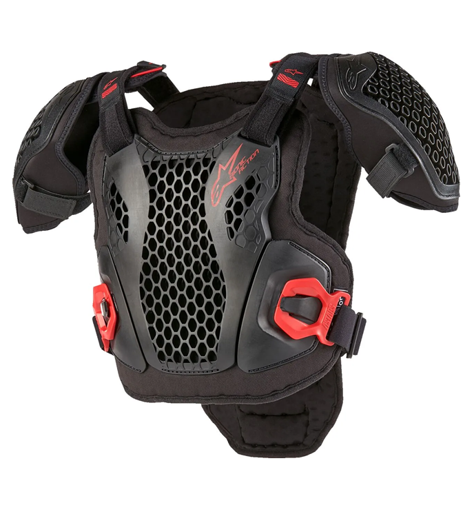 - Bröst- och ryggskyddens öppna rutnätsstruktur är monterad på andningsbar stoppning och konstruerad för att vara både lätt och andningsbar, samtidigt som den garanterar skyddande prestanda.