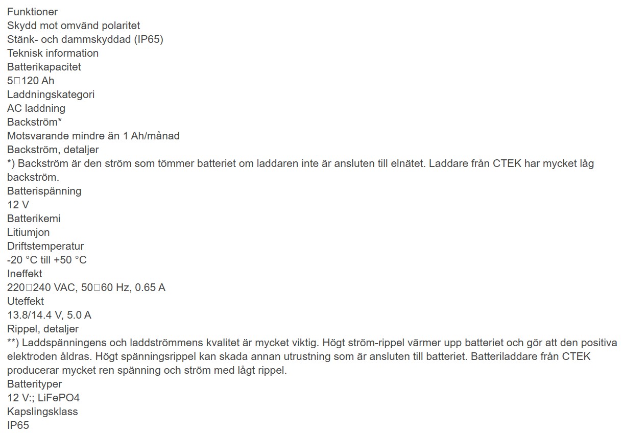 LITHIUM XS är speciellt utformad för litiumbatterier (12V LiFePO4). Den kan med upp till 5 A laddningsström ladda LiFePO4-batterier från 5 Ah till 60 Ah och underhålla upp till 120 Ah. Den är enkel att använda - koppla bara in den och laddningen startar omedelbart. Det finns ingen anledning att koppla bort batteriet och all elektronik med lågspänningsskydd kommer att återställas automatiskt. LITHIUM XS är en ansluta och glöm-laddare med 8 laddningssteg, en testsekvens som berättar om batteriet kan ta och behålla laddning, ett unikt maximeringssteg för att återställa full kapacitet och patenterad underhållsladdning för maximal prestanda, även efter flera månaders inaktivitet.